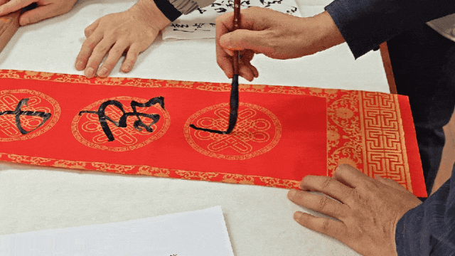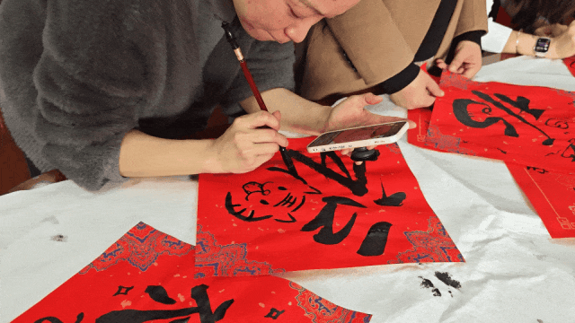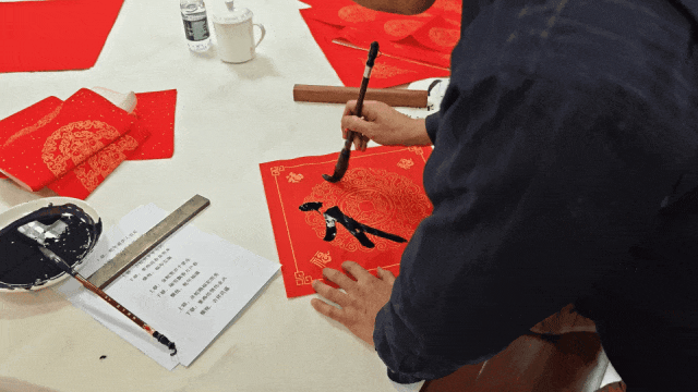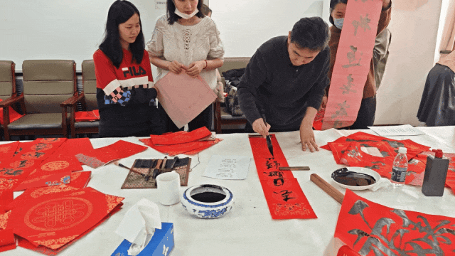书法老师们挥毫泼墨,笔锋游走间,一副副散发着清新墨香的春联和“福”字跃然纸上。